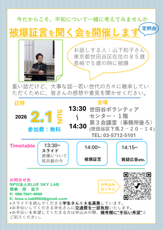 内 容:13:30~スライド、原爆の被害、核兵器の今、14:00~被爆証言(山下 和子さん)、 14:15~14:30質疑応答など